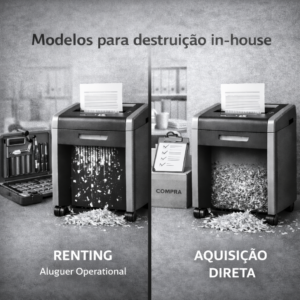 Na prática, existem diferentes formas de operacionalizar a destruição segura de informação dentro da organização. A aquisição direta de destruidoras pode fazer sentido em determinados contextos. O aluguer operacional surge como uma alternativa válida noutros cenários, permitindo custos previsíveis, manutenção incluída e rápida implementação. O essencial, não é o modelo escolhido, mas sim garantir que a destruição é feita dentro de portas, com níveis de segurança adequados ao valor da informação tratada.